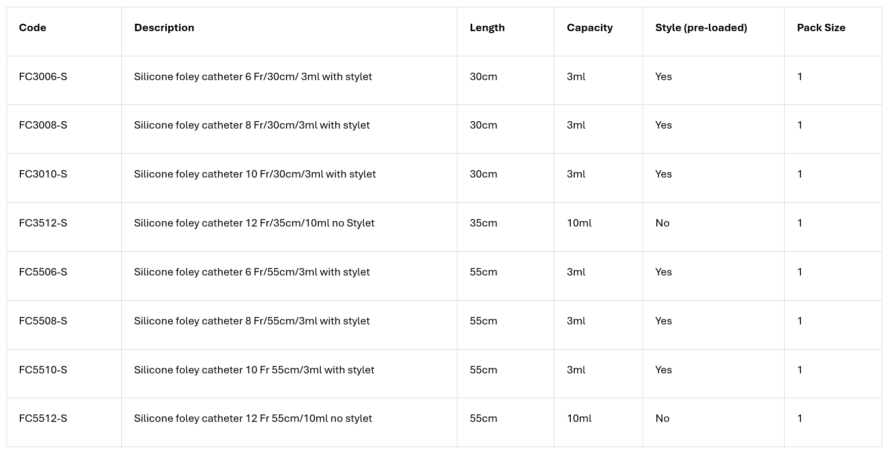 Balloon capacity, tubing length and stylet options differ depending on size (Fr)